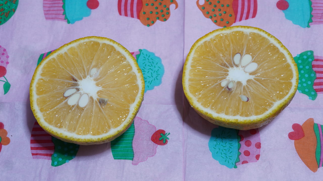 じゃばらの断面は一般的なみかんと同じだが、色が黄色に近い。 まったく甘くないというわけではないのだが、酸味と青っぽい香りが全面に出てくるので、そのまま食べるのにはそこまで向いていないかもしれない。